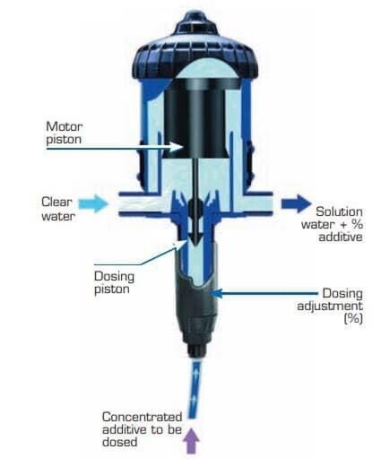 The Dosatron is simple in its operation and works on the energy provided by the flowing water to operate. It needs only 1.6 meters of head to give enough pressure to run the unit continuously. The operation can be seen in the photo below.