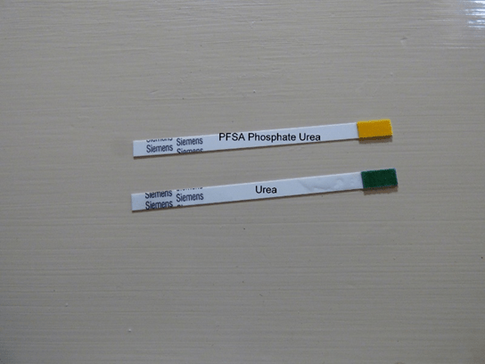 A second strip has been exposed to urea phosphate at 5 grams per litre. As shown, the Urea strip has turned a deep green, showing 1 gram per litre of Urea, while the Urea Phosphate strip is unchanged showing that the urea is protected from breakdown by the urease enzyme. The urease has no effect in converting urea phosphate to ammonia thus making it a safe form of urea. The conversion occurs slowly as the bacteria release the phosphorus bond before attacking the urea molecule. Urea Phosphate is a safe form of urea and will not cause urea poisoning.